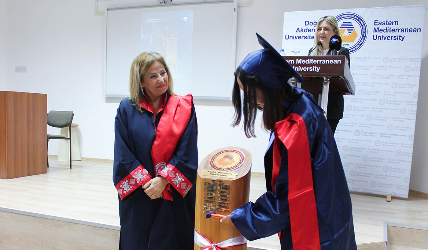 Present at the ceremony were the EMU Rector Prof. Dr. Hasan Kılıç, EMU Vice Rectors Prof. Dr. Osman M. Karatepe, Prof. Dr. Sonuç Zorlu and Prof. Dr. Ali Öztüren, EMU General Secretary Derviş Ekşici, Dean of the Faculty of Health Sciences Prof. Dr. Mehtap Malkoç, Dean of EMU Faculty of Pharmacy Prof. Dr. H. Ozan Gülcan, Dean of EMU Dr. Fazıl Küçük Faculty of Medicine Prof. Dr. Nilüfer Güzoğlu, department chairs, faculty members, students and their families.